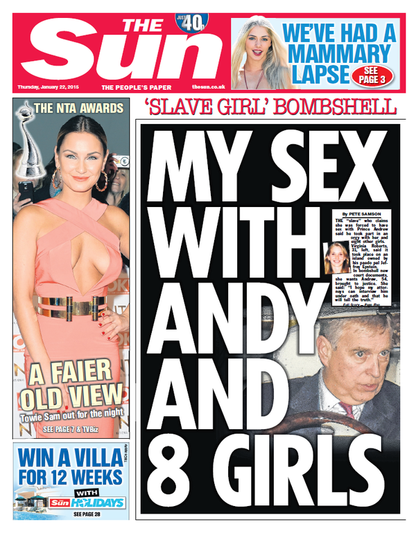 It might not look it, but that is a report about a woman who was kept as a slave and trafficked to rich and famous friends of her abuser between the ages of 15 and 18. New legal documents have been filed, with more detail, and this is how The Sun have chosen to report it: as a fun little royal romp.