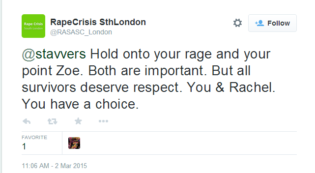 RapeCrisis SthLondon on Twitter   @stavvers Hold onto your rage and your point Zoe. Both are important. But all survivors deserve respect. You   Rachel. You have a choice.
