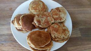 And that’s it. Once you’ve fried up your pancakes, stack them up (or fold them like blinis) and eat with whatever topping you like. They taste almost exactly Scotch pancakes, although they’re a bit lighter, so you can have more than you’d usually have. The texture is also lighter and fluffier. I was genuinely surprised to discover how much they tasted like Scotch pancakes, although without any egginess. As I said earlier, I had mine with beetroot and quark, and tried to eat them like blinis, which was reasonably successful, although it looked somewhat like I’d committed a grisly murder afterwards. I didn’t eat all 30 of them myself, I shared.
